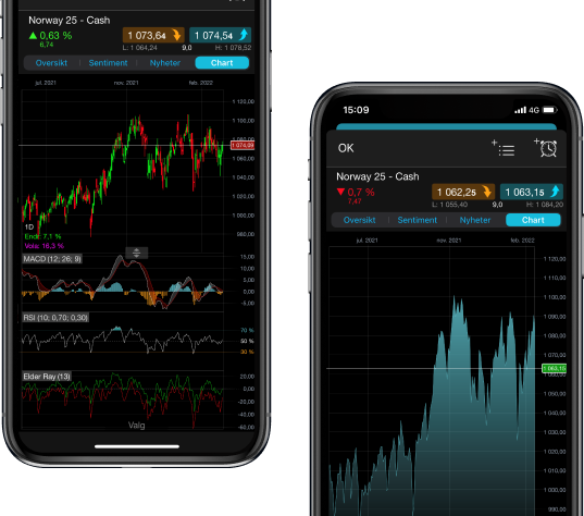 Åpne, steng og endre ordrer direkte fra chart, og se nivåer i forhold til historiske kursbevegelser. Når en posisjon er åpnet, klikker du bare trekantikonet på handelsinngangen i chartet og drar Stop Loss- eller Take Profit-nivåene for å endre dem. "1-Click Trading" lar deg plassere handler umiddelbart ved å klikke på en kjøps- eller salgskurs. De vanlige risikostyrings- og ordeinnstillingene dine vil automatisk brukes.