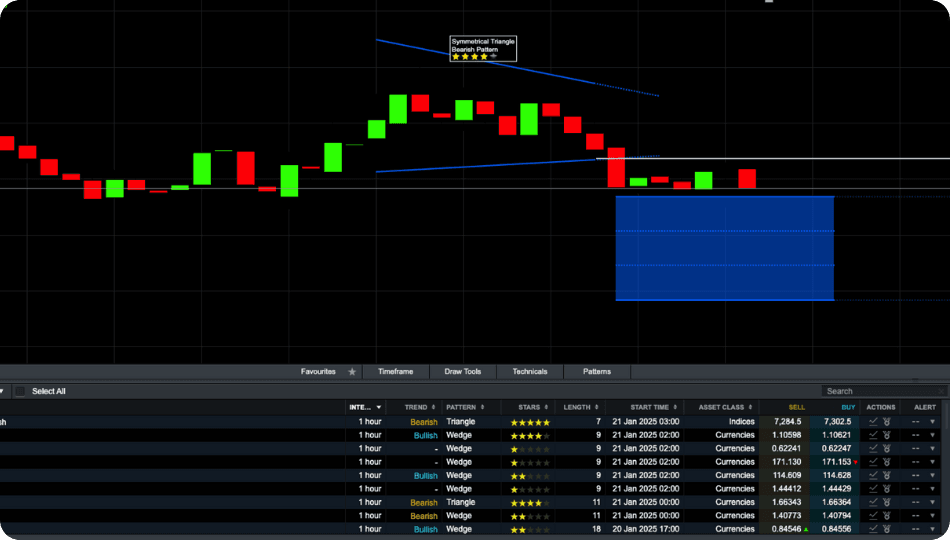 We automatically scan over 120 of our most popular instruments every 15 minutes for emerging and completed chart patterns, such as wedges, channels and head & shoulders formations.