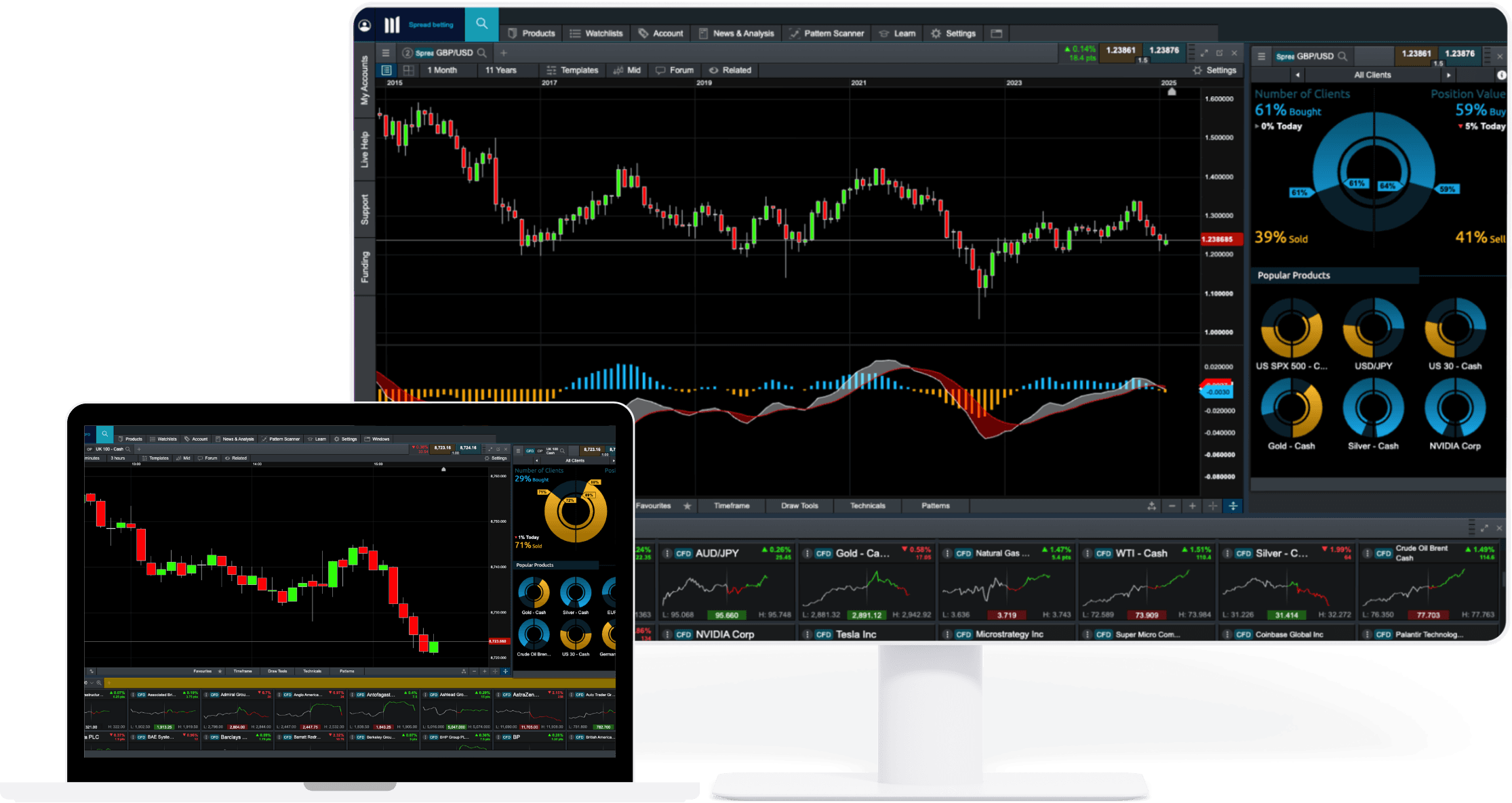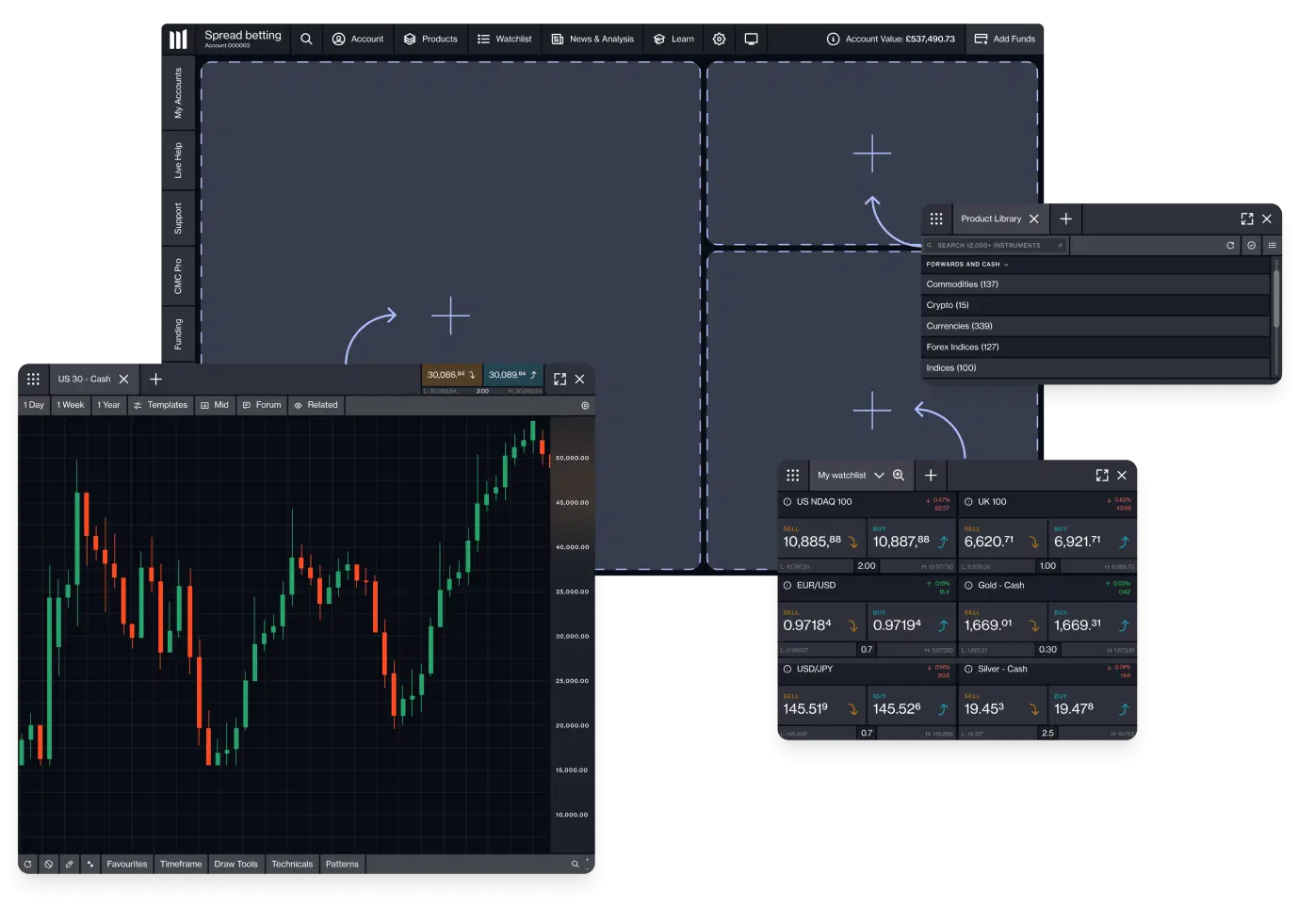 You can spread bet and trade CFDs on 12,000 financial instruments with our award-winning platform. This includes indices, forex, commodities, shares, ETFs, and treasuries, as well as our exclusive share baskets, forex indices and commodity indices. Our platform is equipped with a number of powerful features and tools, including a comprehensive charting package.